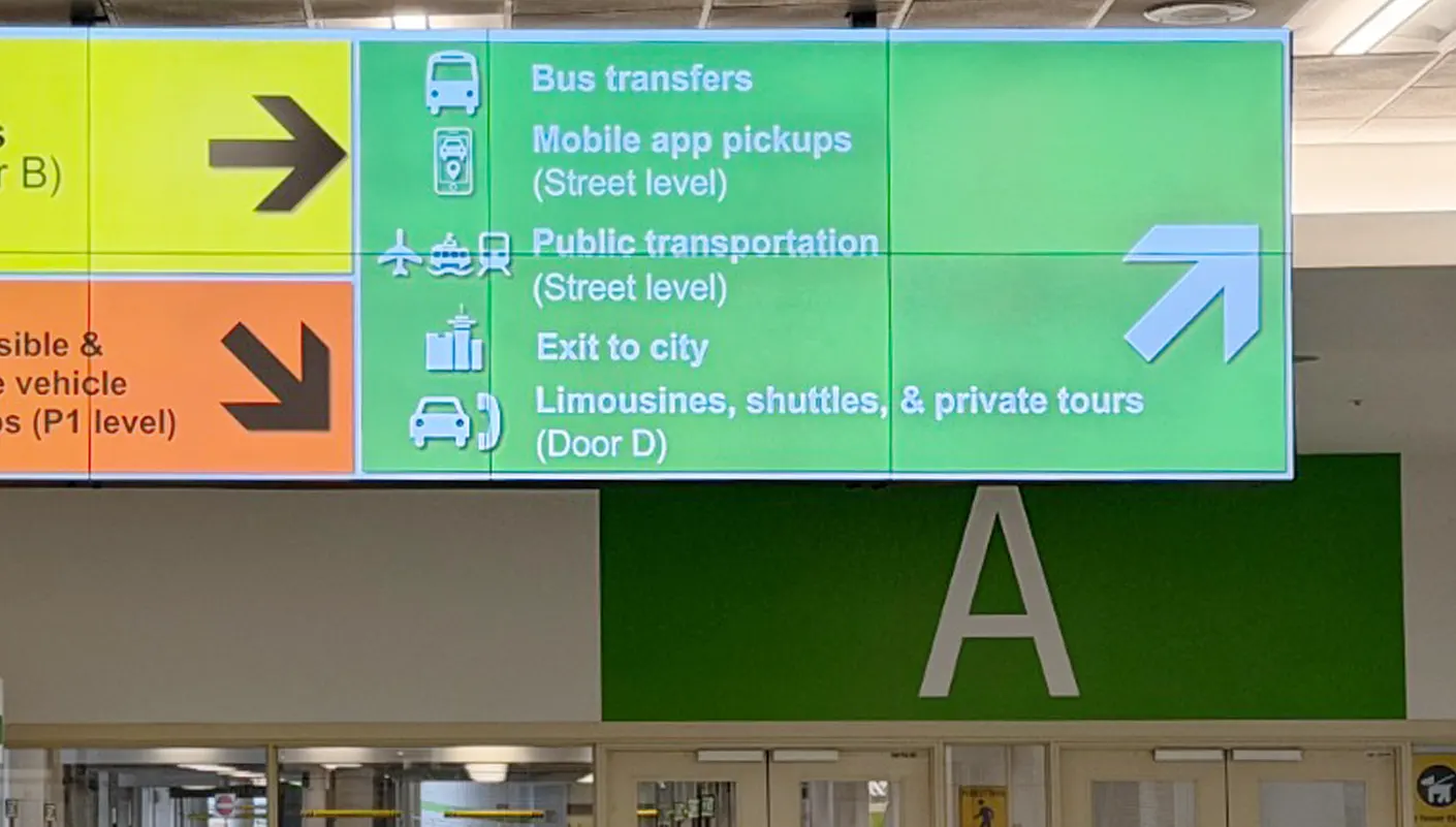- Visual Reference: Please refer to the photos below showing directional signage to Door D, Door D entrance, limousine dispatch booth and pickup area.